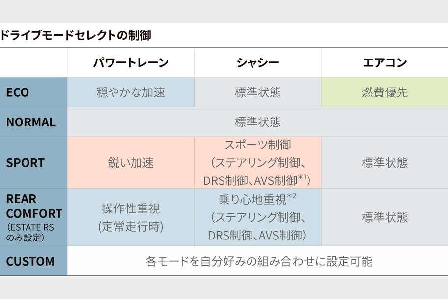 *1. ESTATE RSのみ設定。 *2. 前席だけでなく、後席の乗り心地も重視した乗心地優先のモードです。