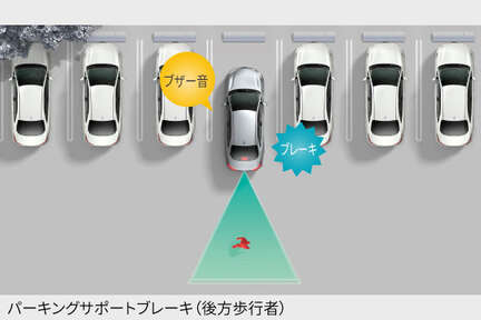 〈パーキングサポートブレーキを安全にお使いいただく上での注意事項〉 ■パーキングサポートブレーキは衝突被害軽減ブレーキまで働くシステムではありますが、必ず止まることを約束するものではありません。道路状況、車両状態および天候状態等によっては作動しない場合があります。また、衝突の可能性がなくてもシステムが作動する場合もあります。詳しくは取扱説明書をご覧ください。 ■安全運転を行う責任は運転者にあります。常に周囲の状況を把握し、安全運転に努めてください。 ■ソナーおよびレーダー、カメラの検知範囲、作動速度には限界があります。必ず車両周辺の安全を確認しながら運転してください。 ■運転者自身でパーキングサポートブレーキの衝突被害軽減ブレーキ制御を試すことはおやめください。 ■パーキングサポートブレーキの衝突被害軽減ブレーキが作動した場合でもブレーキ制御は2秒で解除されるため、そのまま前進・後退できます。また、ブレーキペダルを踏んでもブレーキ制御は解除されるため、再度アクセルペダルを踏むことで前進・後退できます。 ■パーキングサポートブレーキ(後方歩行者)は、歩行者以外の立体物に対しても作動することがあります。ブレーキ作動後はブレーキを踏んで周囲の確認をお願いします。