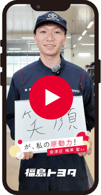 小さい頃から車が好きで、ラジコンを分解したり構造を見たりという作業を繰り返していました。福島トヨタを選んだのは、生まれ育った福島で地域の皆さまのカーライフを長年サポートしているところに魅力を感じたから。また、職場見学の際の明るい雰囲気がいいなと思い、自分もここで働きたいと思ったからです。実際働いてみて、スタッフ間の仲の良さや本部・店舗ともにサポート体制が整っている点など、外から見える以上に職場環境はいいですね。常に進歩し続ける車の知識と技術を高めていくのは純粋に楽しいですし、自分の成長とお客さまからの感謝はやりがいに直結します。お客さまから信頼して任せていただける人材であり続けることが一番の目標です。