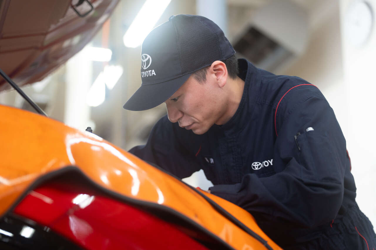 幼少期から貨物列車のエンジニアとして働く父の背中を見て、手に職をつけたいと志しました。福島トヨタは独自の自動車専門学校就学支援制度を利用して専門学校に通えたことが入社の決め手です。現在、会津店で自動車の検査や修理を担当しています。難しい修理を成し遂げた達成感や、納車の際にお客さまから「ありがとう」と声をかけていただけたときに、大きなやりがいを感じます。エンジニアスタッフは高い技術力を持ち、「お客さまに指名いただく」ことを常に意識しています。私も選ばれるエンジニアを目指し、日々精進しています。職場は上下関係がフラットで楽しく、設備も充実。高度化する自動車に対応するため、最新技術を常に習得し、お客さまのカーライフをサポートしていく使命感と喜びを感じられる仕事です。