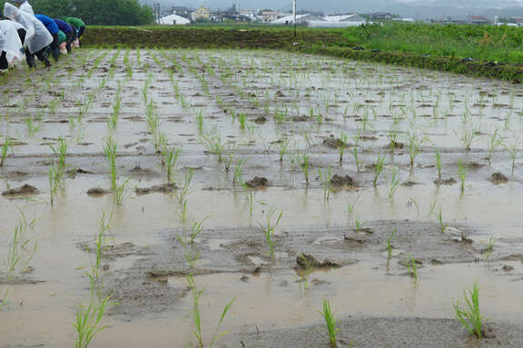 スタートの田植えはあいにくの雨模様でしたが、農業経験のほとんど無い参加者はテンション高めのため、気になることは無さそうです。DATSU RICE FARMの津田さんは手植えの指導は初めてだったものの、近隣のベテラン農家の方にもお手伝いいただきながら、約2時間で1反5畝の田んぼに苗を植えることができました。